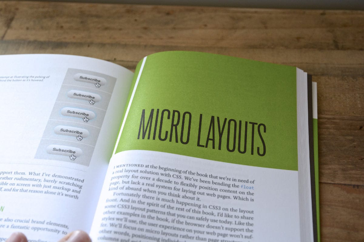 Additionally, a new chapter was added at the end of the book that covers micro layouts. While we wait patiently for a truly cross-browser layout system, work carries on. Fortunately, new specifications such as flexbox and multi-column layout are usable today, when applied to smaller components of the overall design. We'll introduce utilizing those options that will then become extra tools in your CSS3 toolbox.